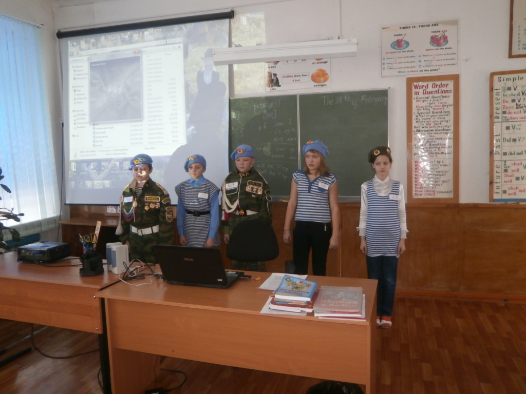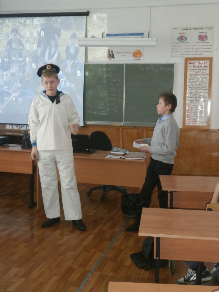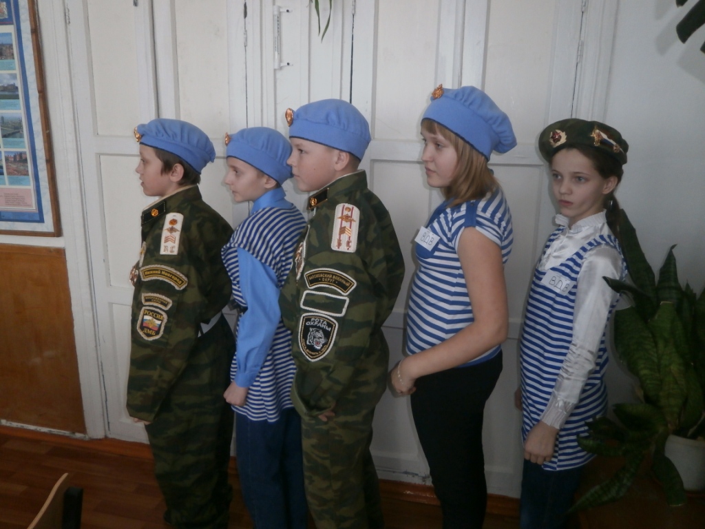 Ребята 5-6 класса представляли ВДВ (воздушно-десантные войска). Ребята 7, 8 класса приготовили презентацию о военно-морском флоте. Чухнов Владислав представил костюм жителя села Вилково Баландина Николая Николаевича, служившего в морфлоте в середине 20 века. Морская форма Баландина Николая подарена в музейную комнату школы. На празднике присутствовала семья ученика 6 класса Семеняка Никиты.