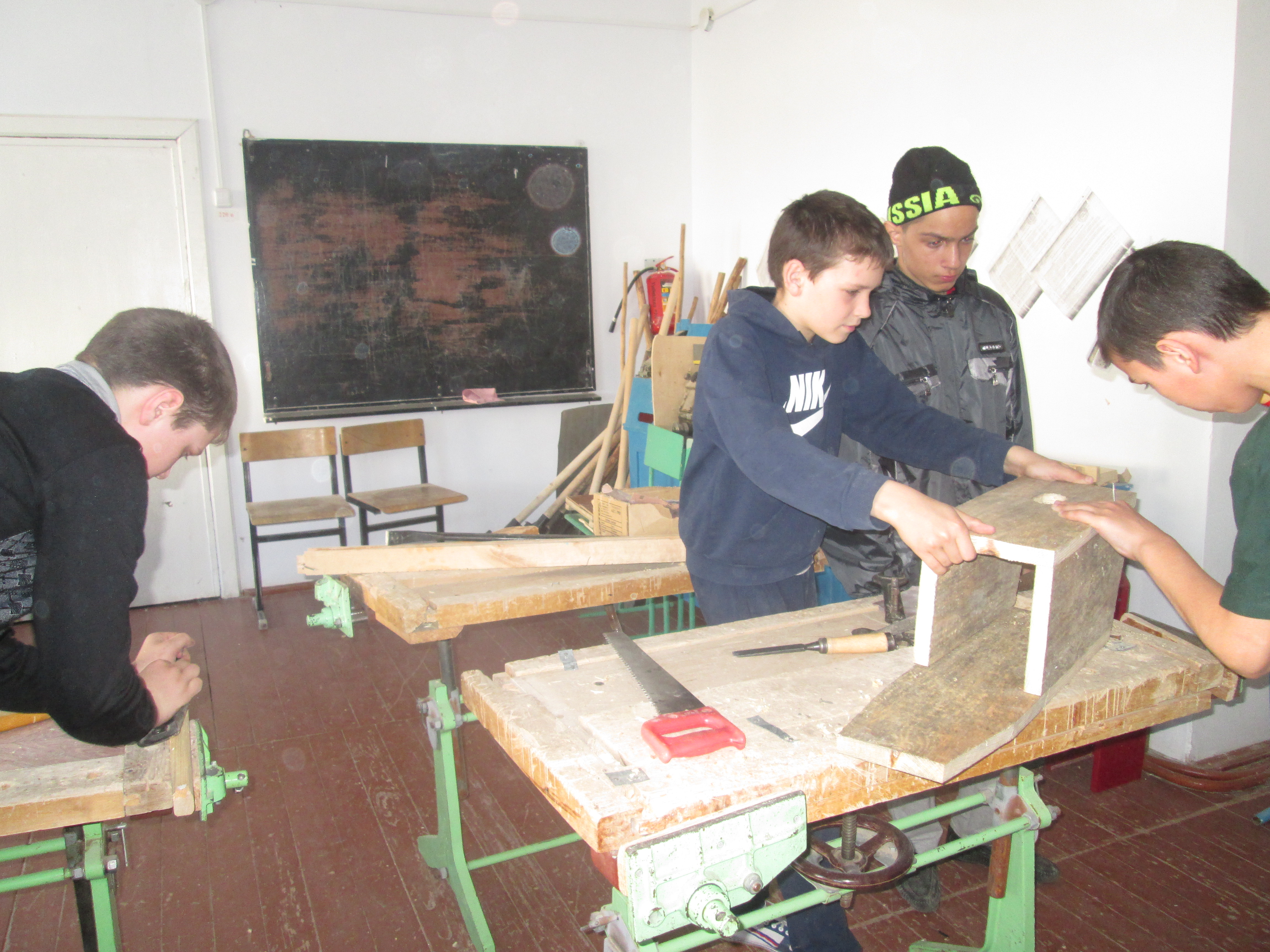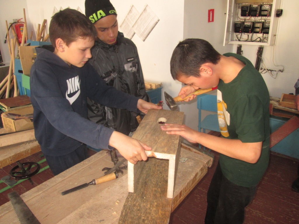 На занятиях кружка «Умелые мастера» под руководством Басова Виктора Степановича мальчишки занимались строительством домиков для скворцов.