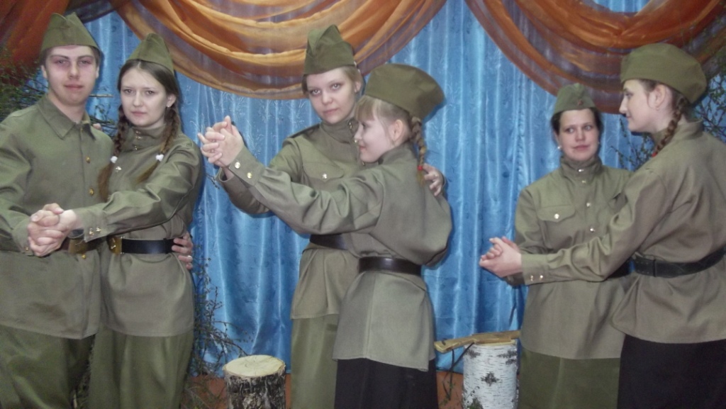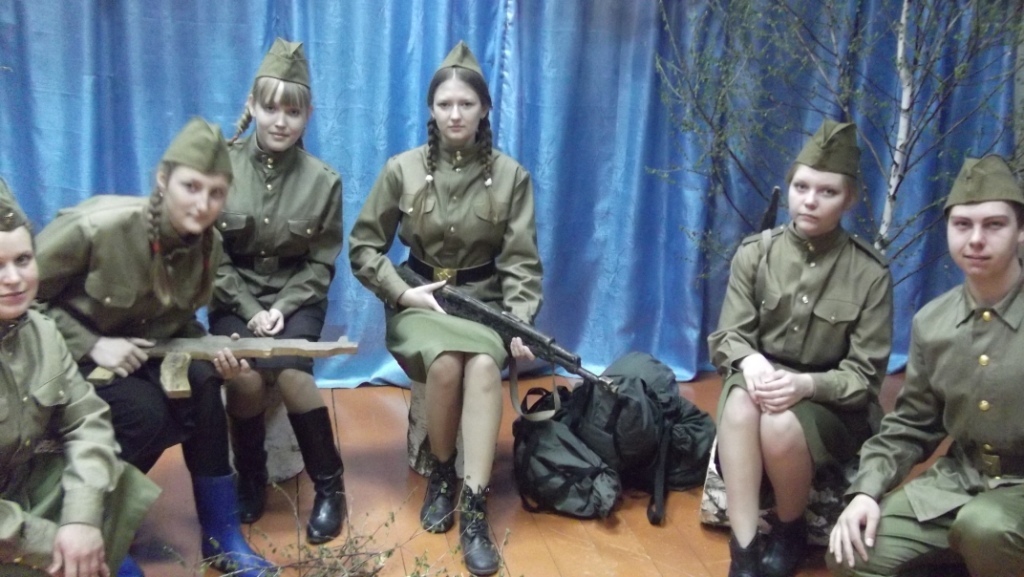 После минуты молчания присутствующие возложили цветы и венки к памятнику воинам, погибшим в грозные годы Великой Отечественной войны. Девчата с 8=11 класс были участниками театрализованного представления «А зори здесь тихие».